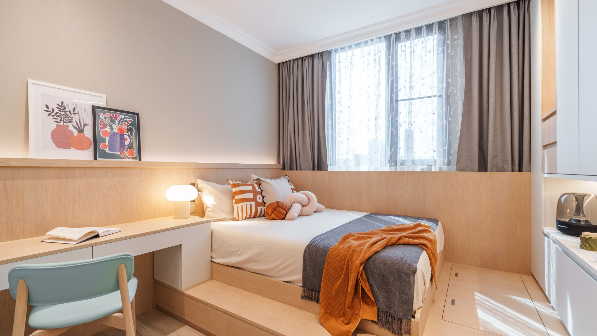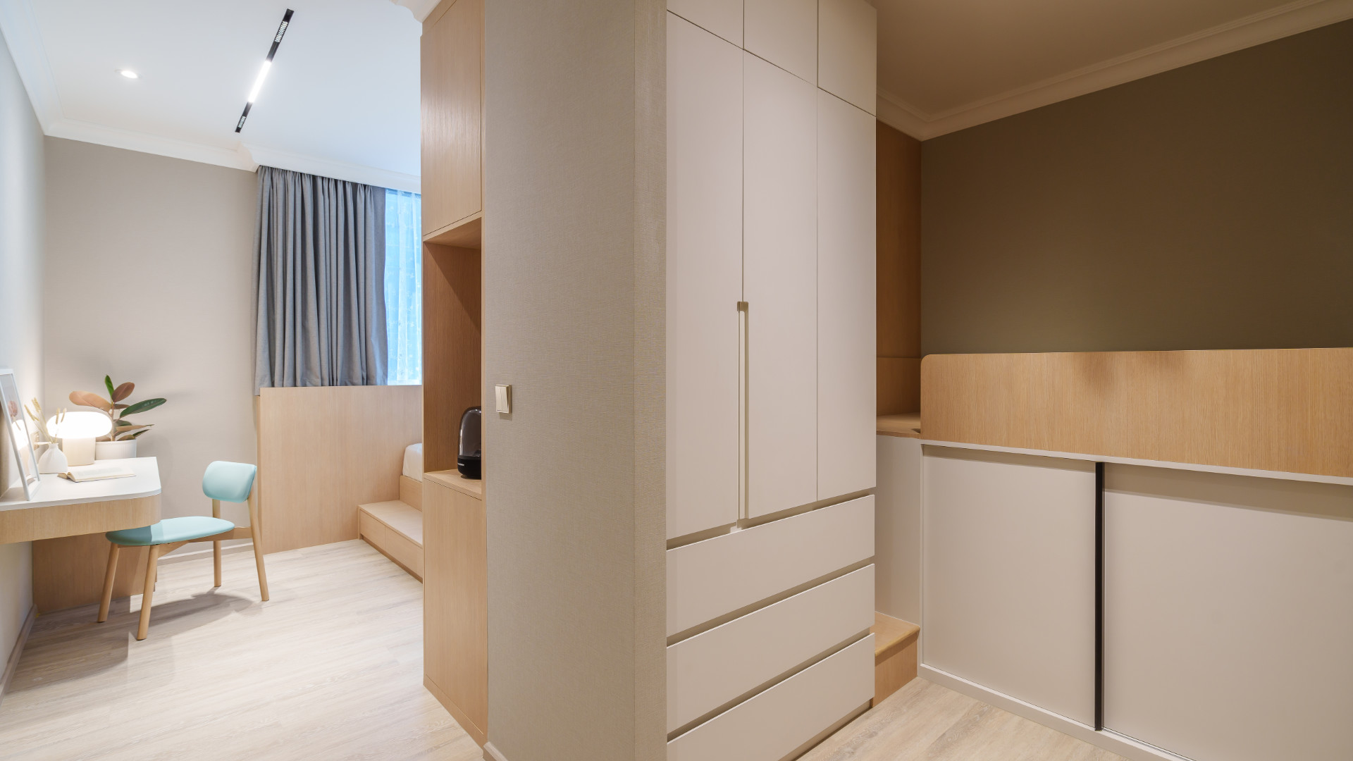 – Guest Bedroom: With a multifunctional tatami platform and integrated workspace, the guest room maintains a sleek, minimalist feel.