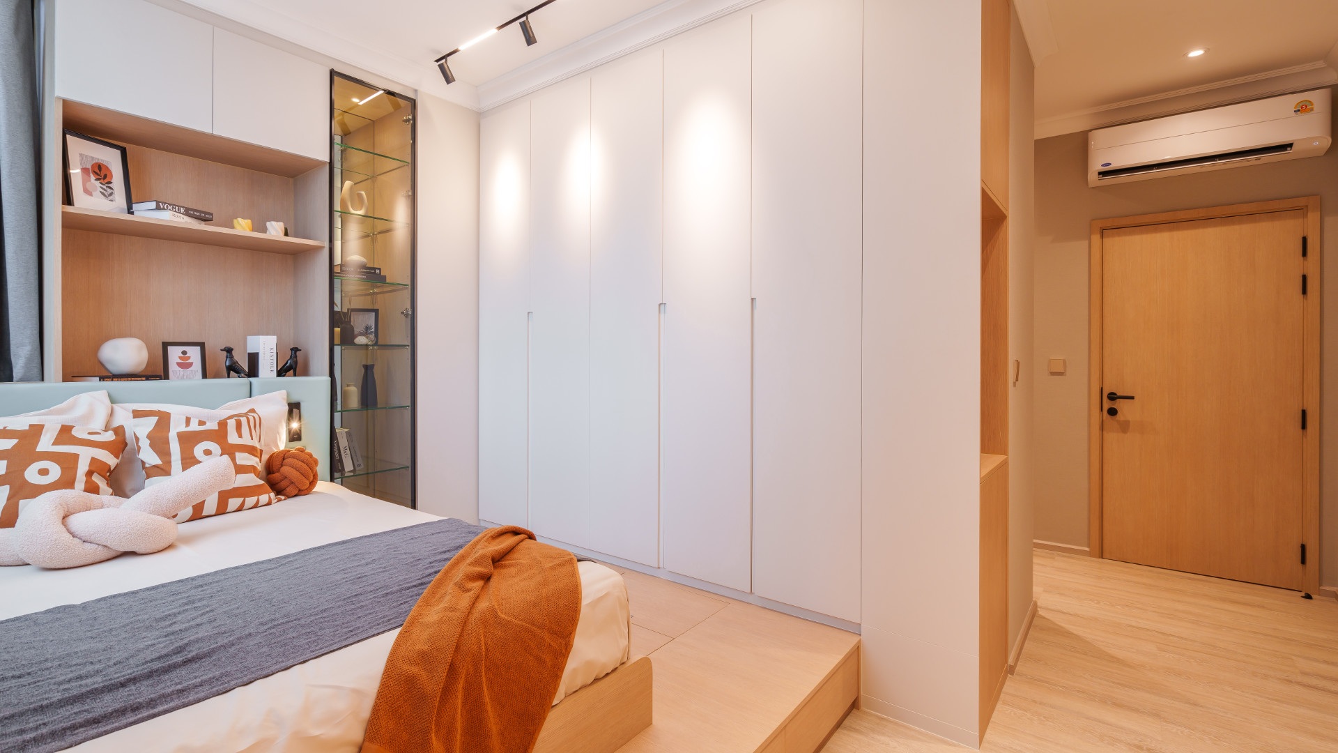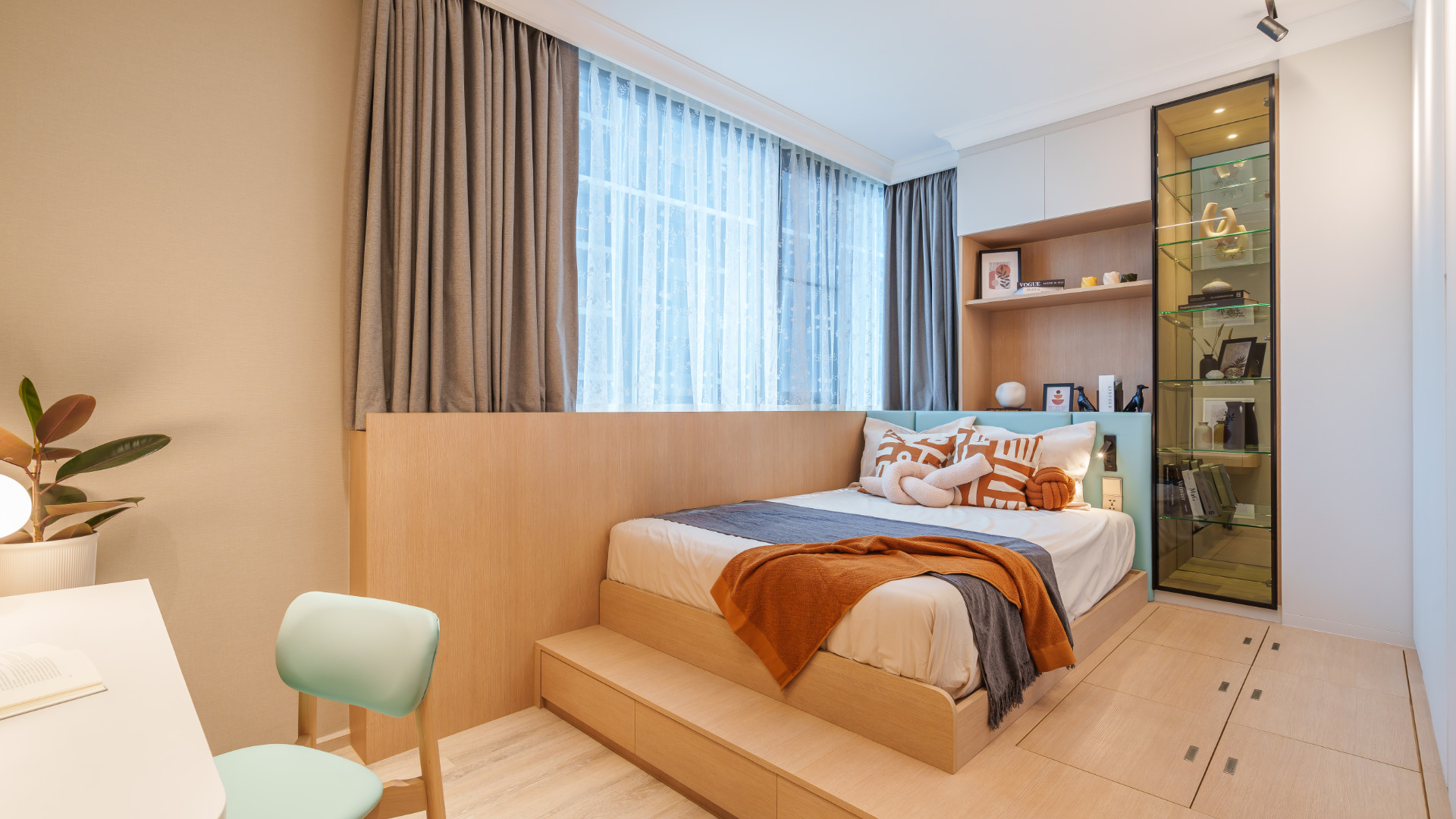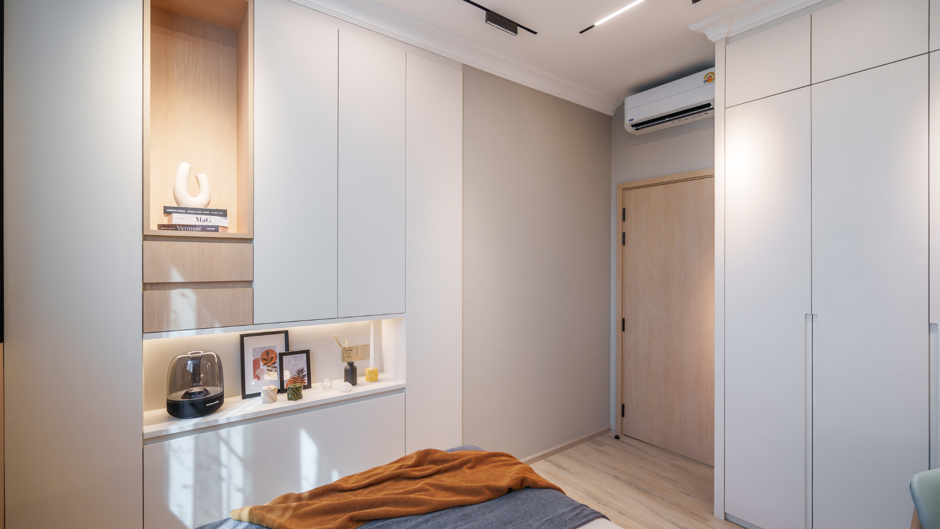 – Master Bedroom: Featuring a tatami-style platform with under-bed storage, hidden compartments, and a full-length closet wall, the master bedroom offers both practicality and a clutter-free aesthetic.