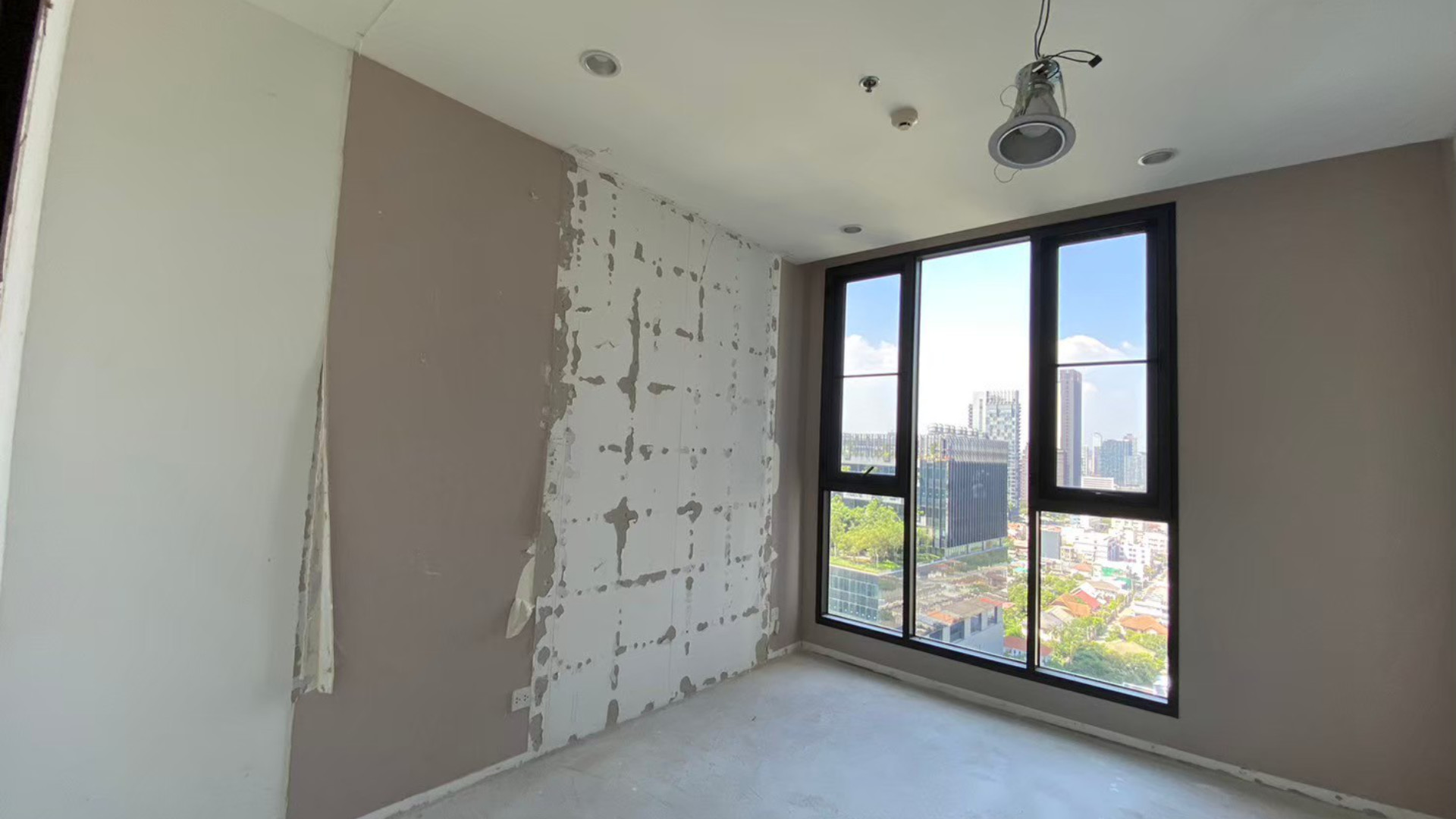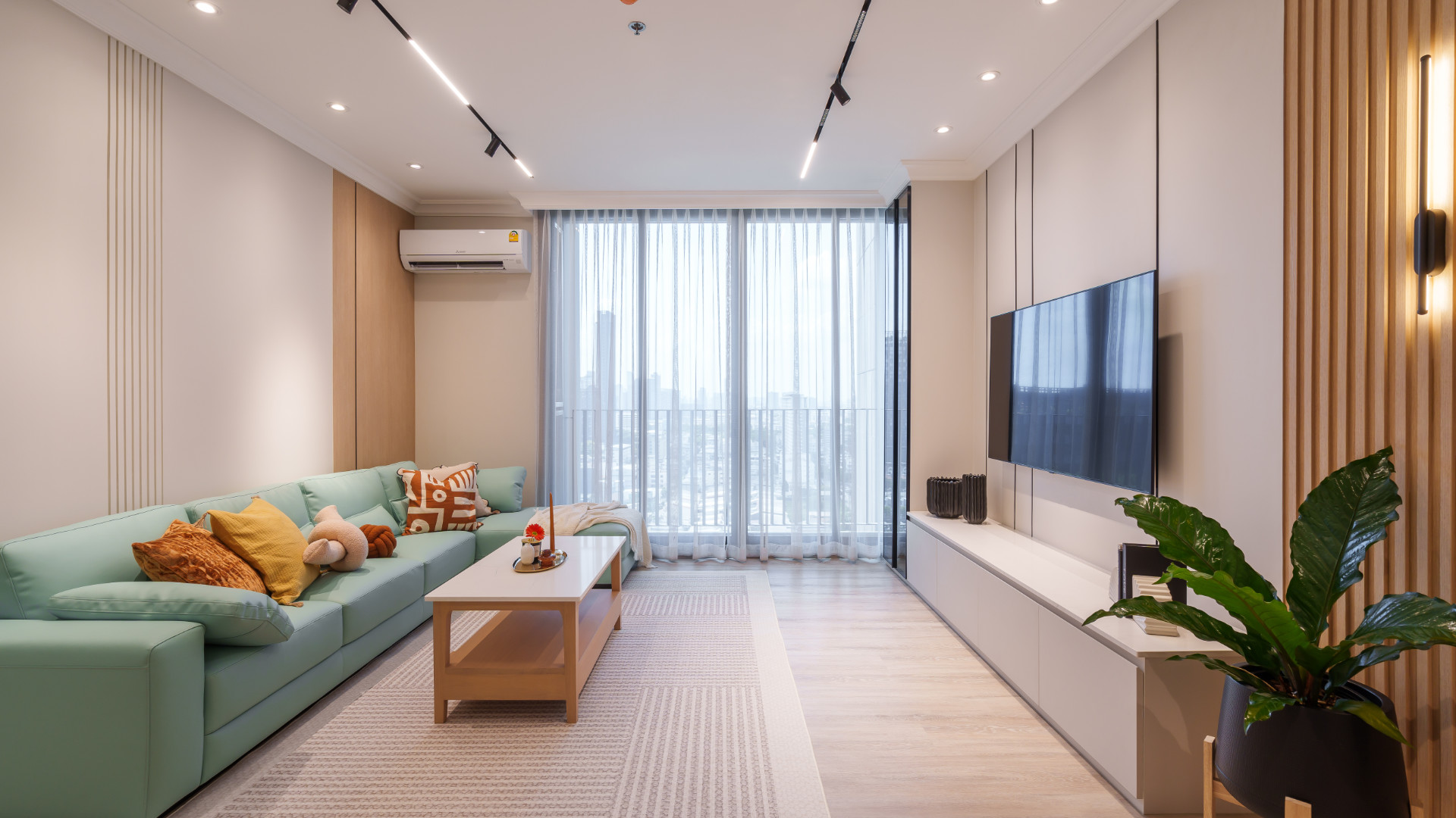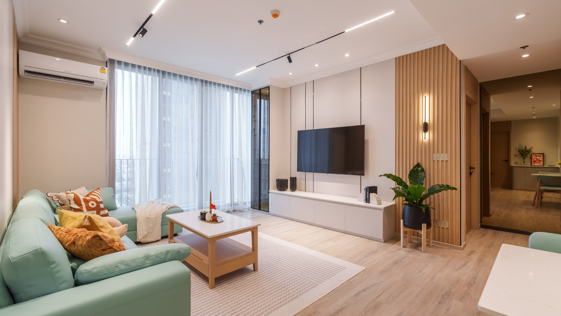 This comprehensive interior design project involved a full renovation of an 18th-floor unit in Whizdom 101 Essence. Originally a second-hand property, the unit was stripped to its bare structure and entirely rebuilt to create a sleek, modern residence blending comfort with warmth. Designed for a client from China who chose Bangkok’s vibrant 101 The Third Place development as their home base, this renovation transformed the space into a cozy, minimalist sanctuary tailored for urban living.