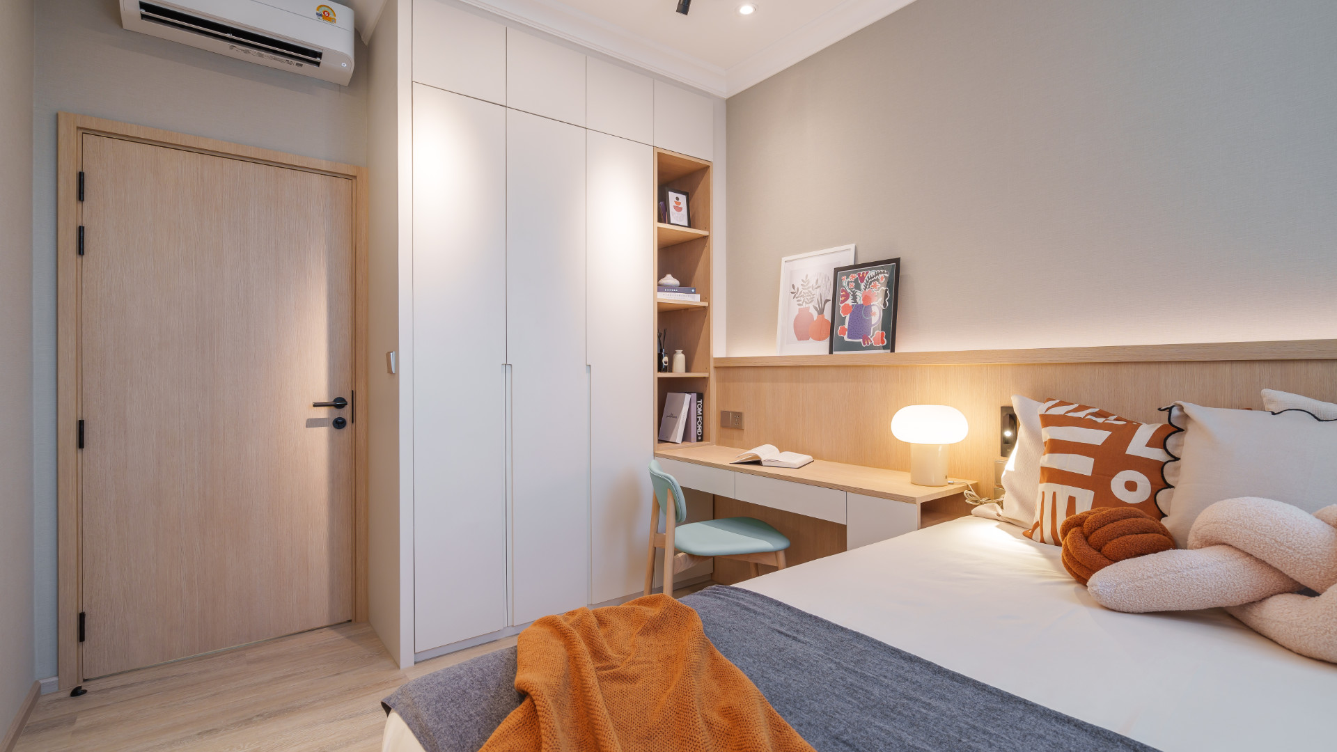 This design embodies “cozy minimalism,” focusing on clean lines, soft tones, and natural materials. Textured wallpapers, high-quality laminates, and hidden handles enhance its modern yet inviting appearance, while wood accents and recessed lighting add warmth. Black aluminum hairline slats provide a subtle, contemporary edge.