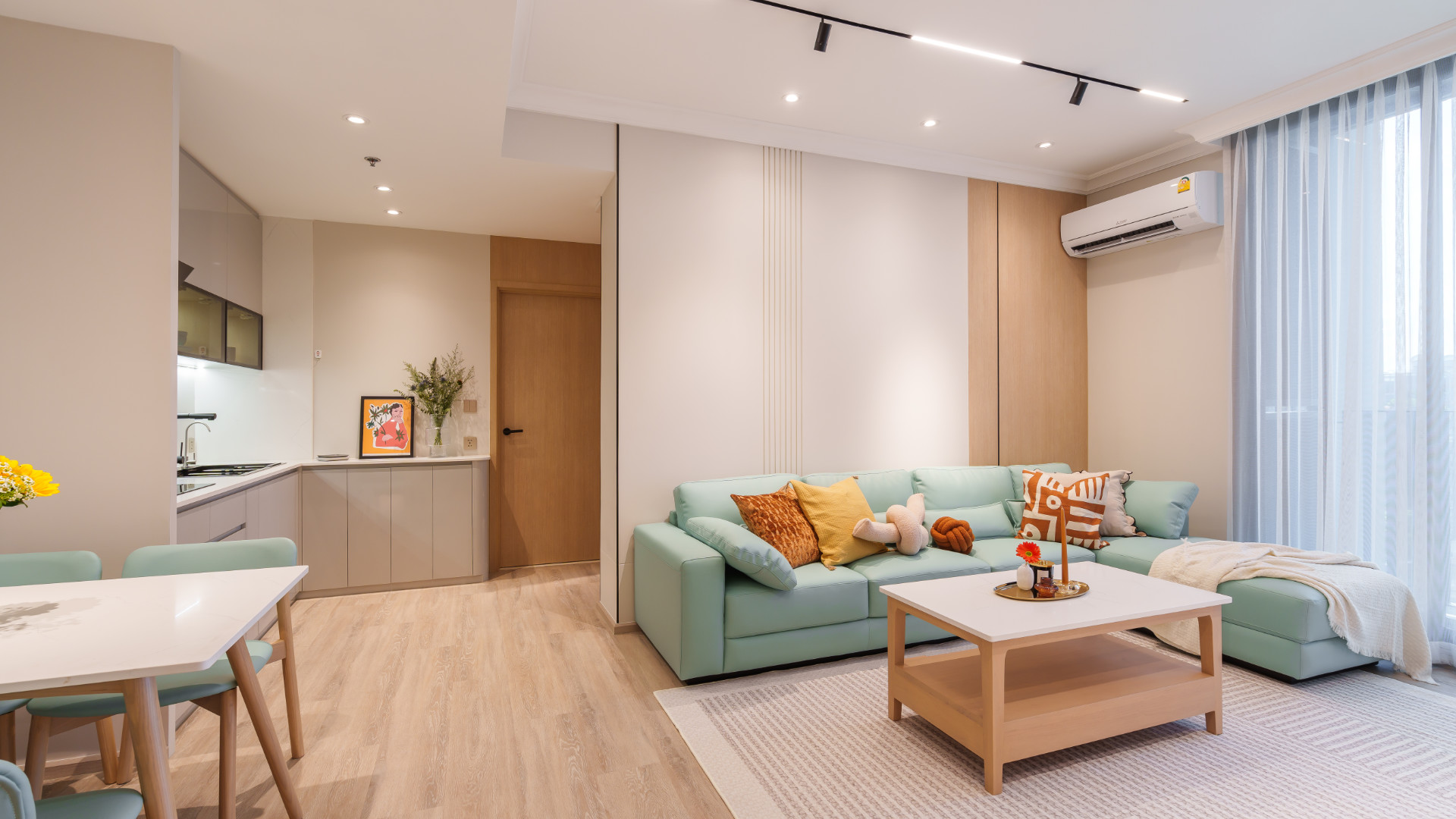 – Living Area: Anchored by a striking 3-meter-long sofa in a Tiffany hue, this open-concept area flows seamlessly into the dining space, maximizing both usability and visual appeal.